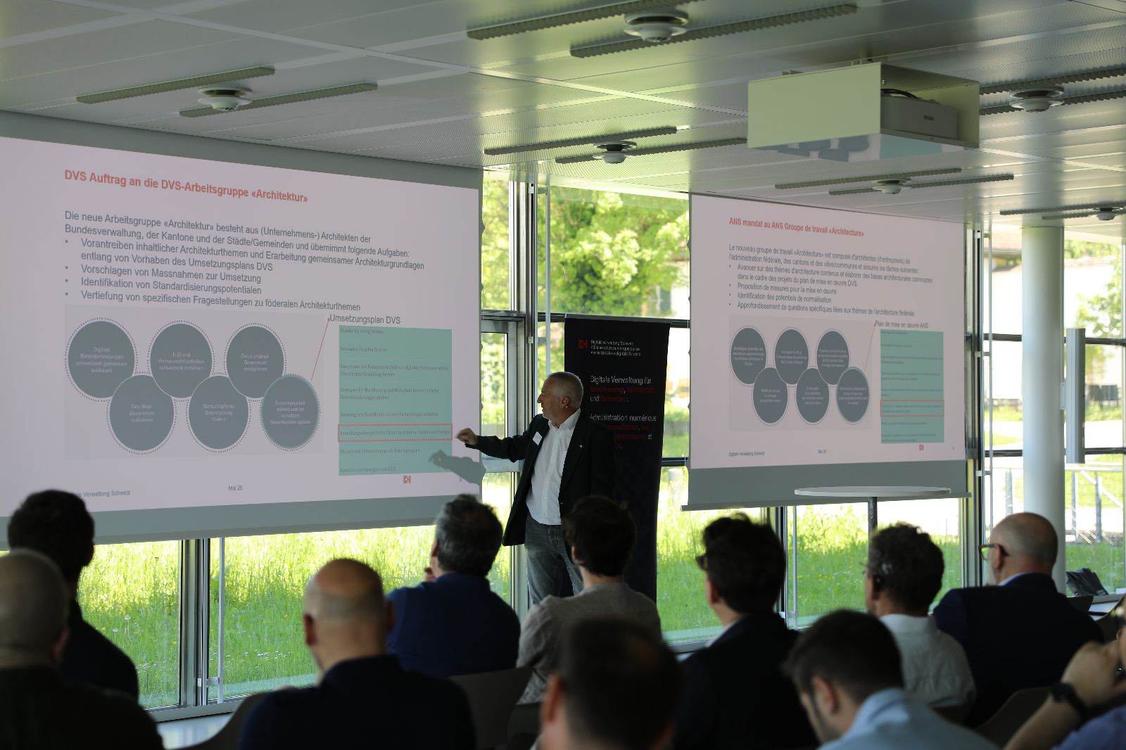 Am 14. Mai 2025 fand das erste DVS-Architektursymposium im Centre Löwenberg Muntelier statt – eine gemeinsame Veranstaltung der Arbeitsgruppe Architektur der Digitalen Verwaltung Schweiz (DVS) und dem Bereich Digitale Transformation und IKT-Lenkung (DTI) der Bundeskanzlei. Mit über 120 Anmeldungen und fast ebenso vielen Teilnehmenden war der Anlass ausgebucht.