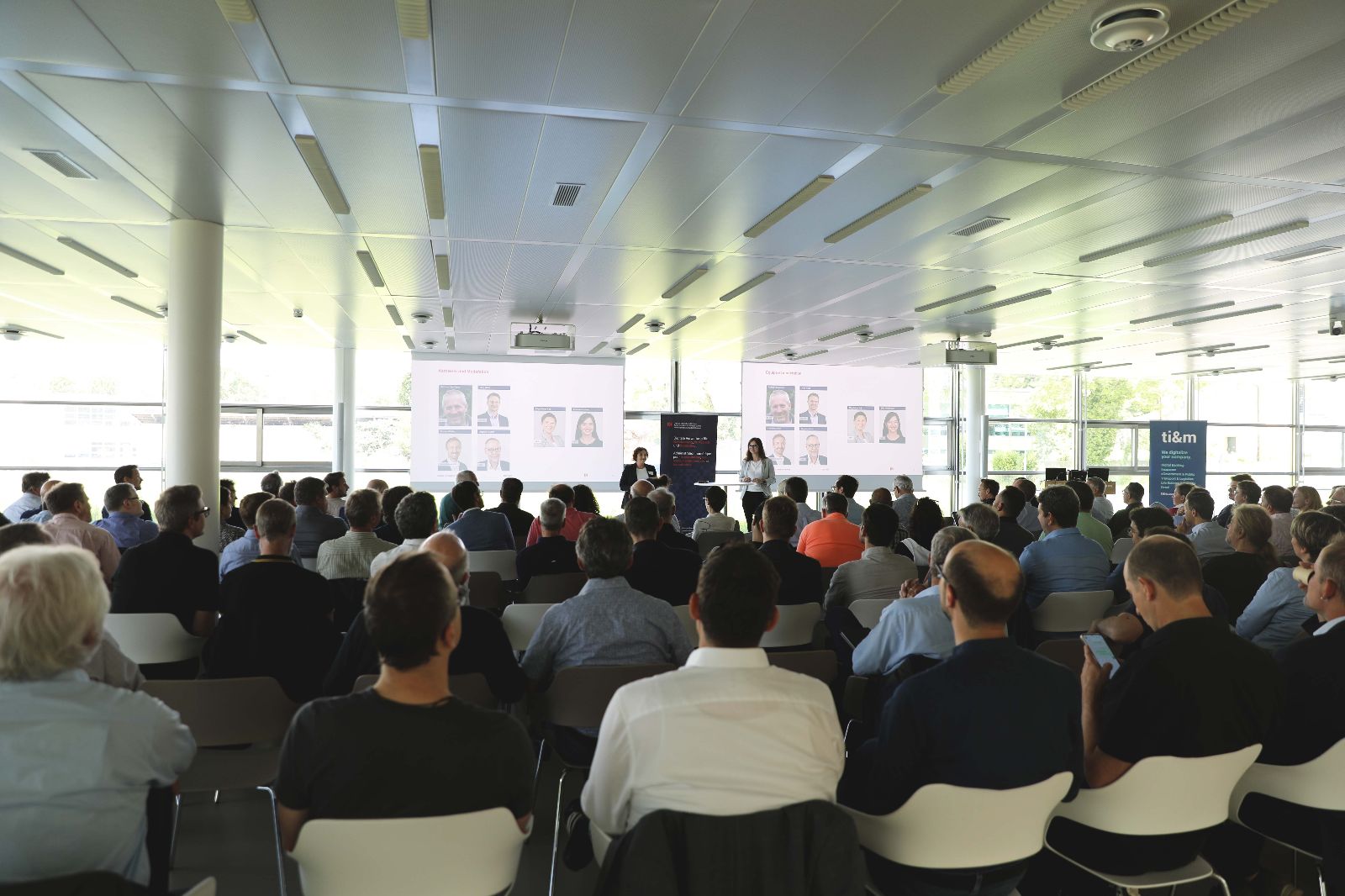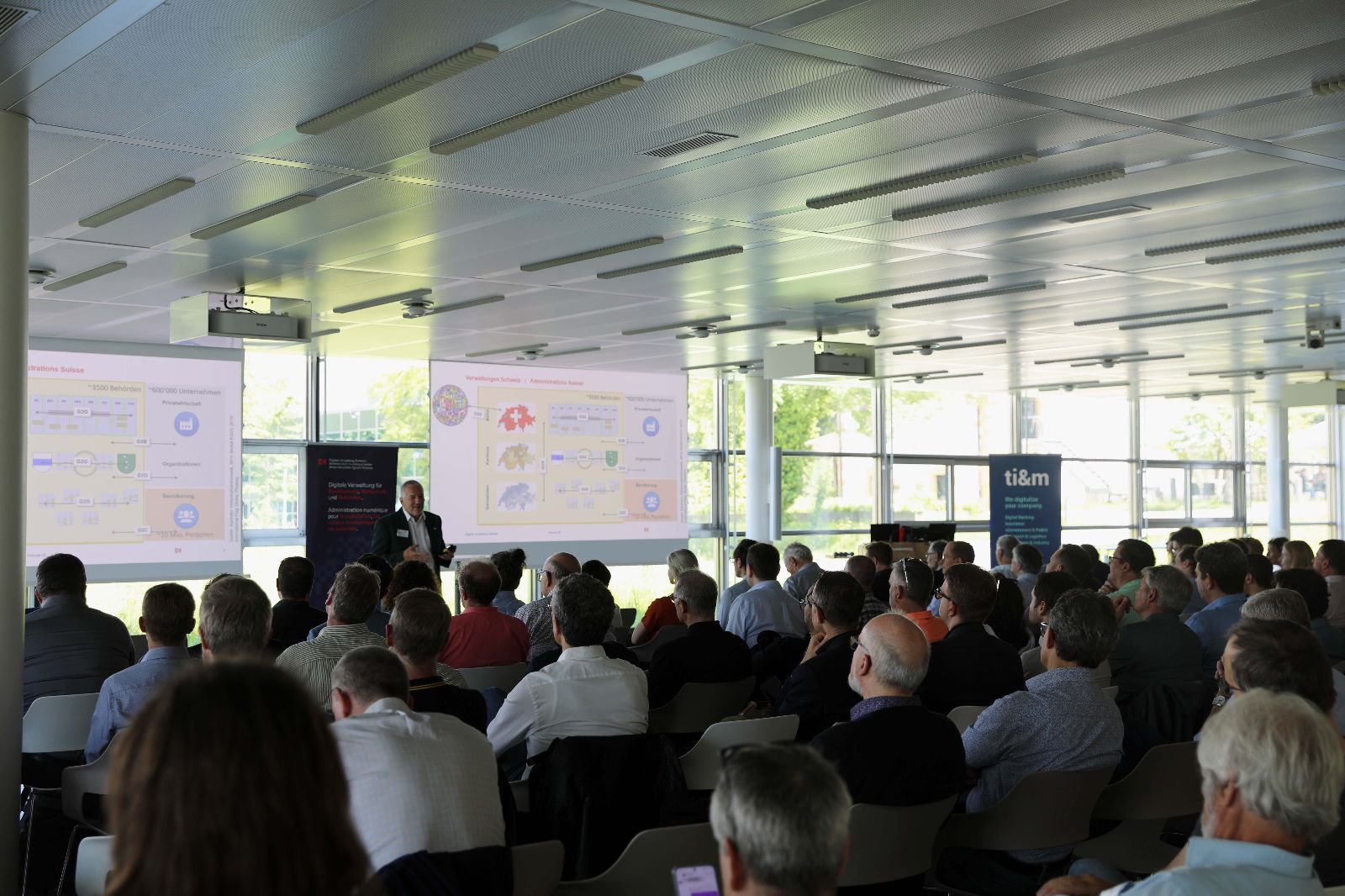 Es werden auch Fragen aus dem Plenum aufgegriffen, wie z. B. die des tatsächlichen wirtschaftlichen Nutzens der hohen Investitionen, wenn man bedenkt, dass im Durchschnitt alle Einwohnenden lediglich 1,6 Behördengänge pro Jahr absolvieren. Hier wird aus Verwaltungssicht insbesondere betont, dass die Schaltertätigkeit bei weitem nicht die ganze Behördentätigkeit abbildet und dass die digitale Transformation zu grossen Effizienzgewinnen über die ganze Verwaltung hinweg führt und sich insbesondere in jenen Prozessen lohnt, in denen derzeit noch Medienbrüche stattfinden.